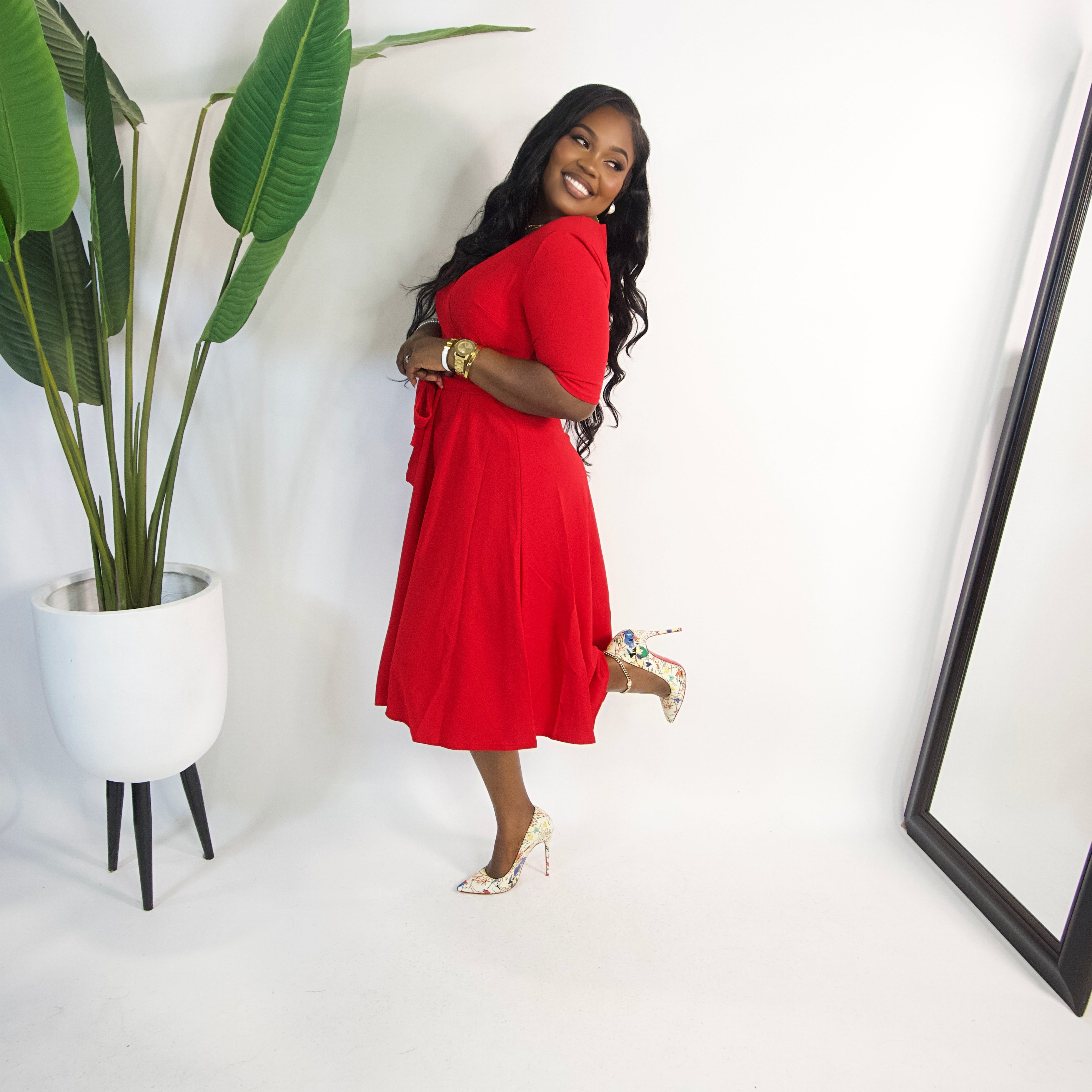Fiona Flare Self Tie Midi Dress||RED