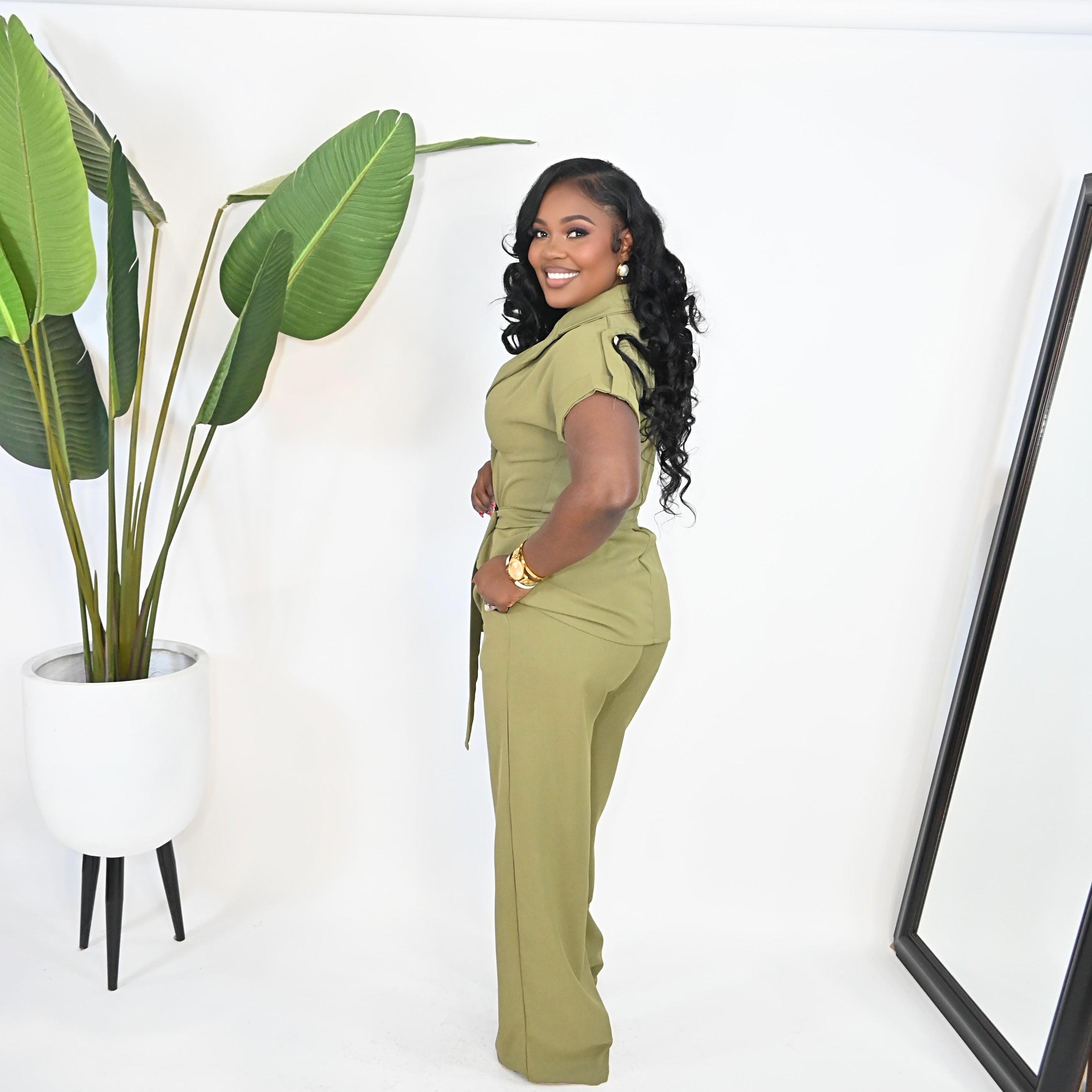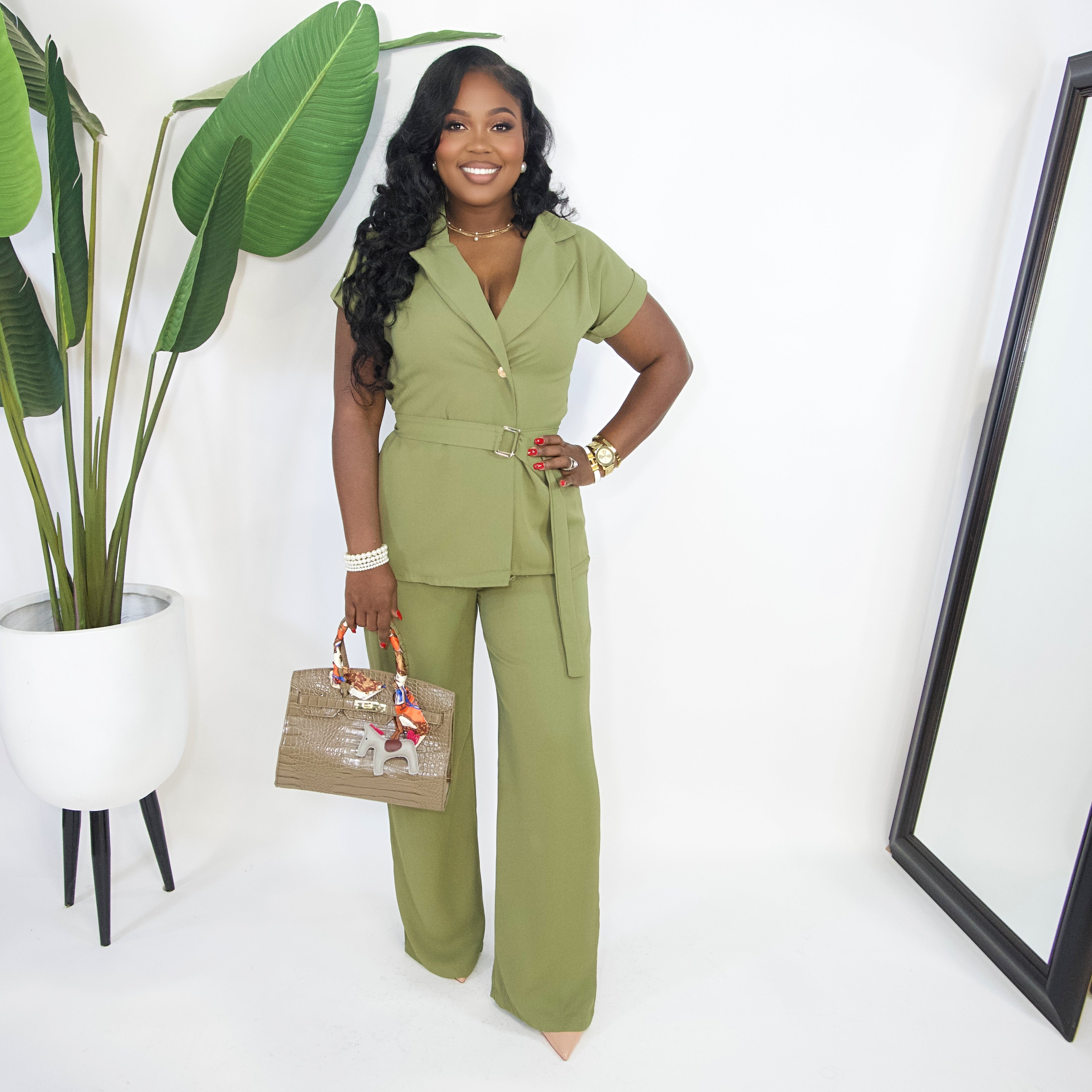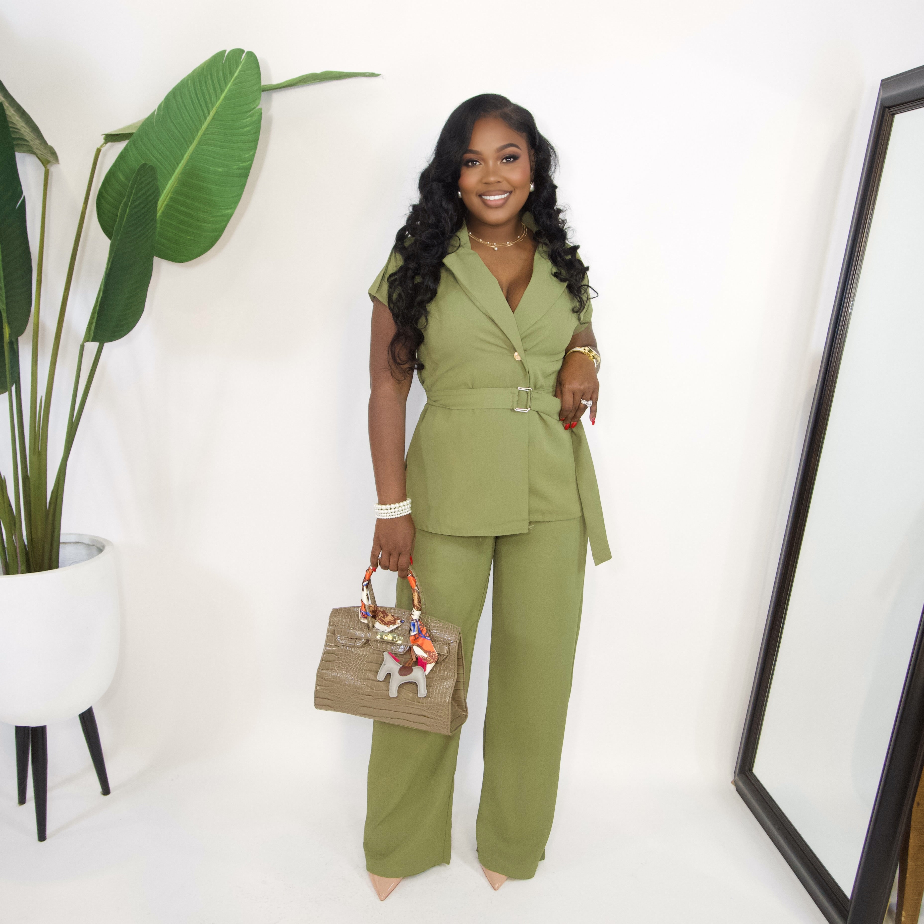 The Kalia Wrap Belted Set features a soft, wrap-style top that cinches the waist for a clean, polished look. The  pants include a comfy elastic waistband and functional pockets, making this set effortless, elegant, and perfect for work or any classy-gyal moment. FIT & DETAILS • Pants have elastic waistband • Pants have pockets • Top oversized • Garment tags: M, L, XL, 2XL Sold as: S, M, L, XL • Model is wearing size tagged as Large (sold as Medium) • COLORS MAY VARY SLIGHTLY DUE TO LIGHTING & MONITOR RESOLUTION