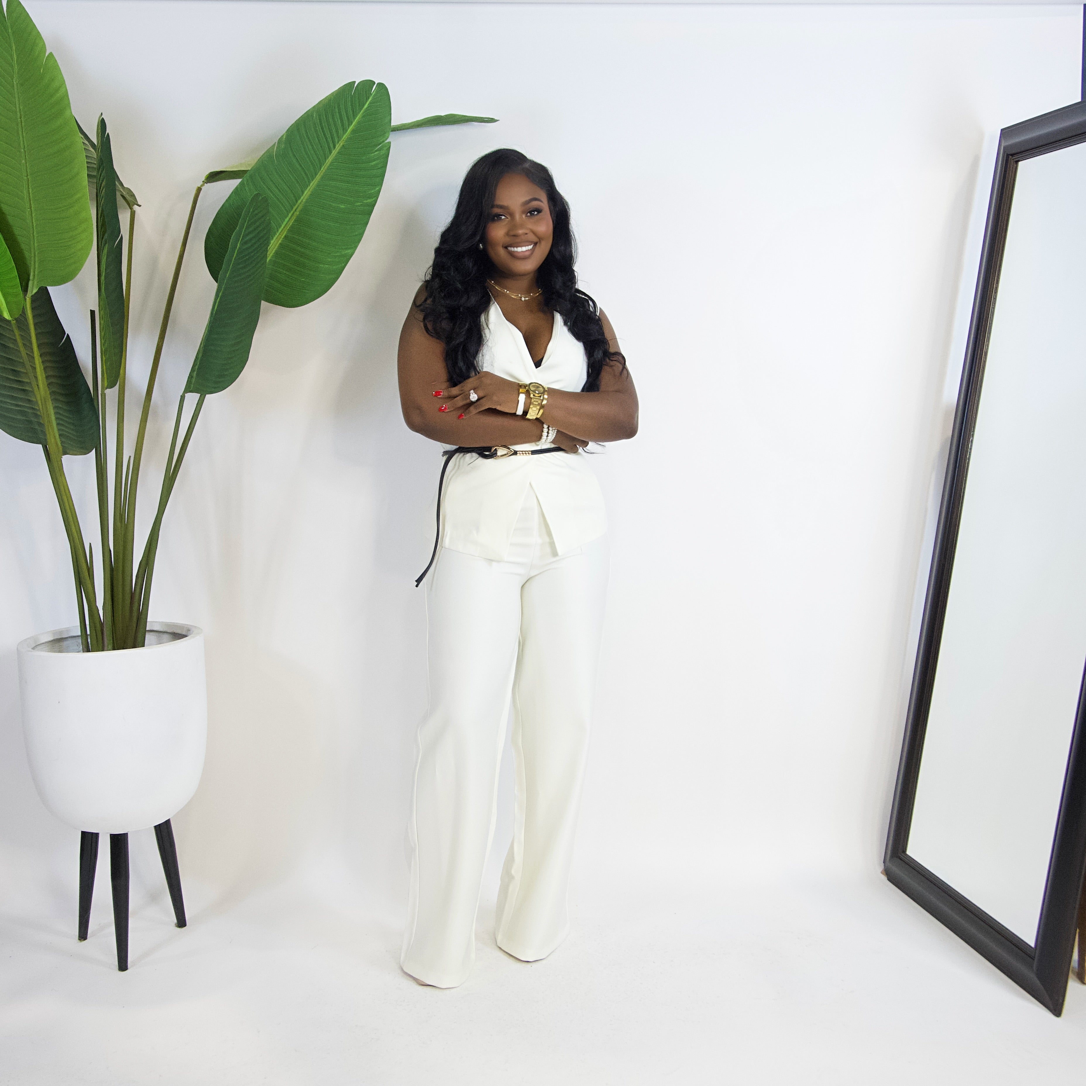 A refined two-piece crafted for clean, effortless elegance. The sleeveless vest fastens with a chic metal flower hook, creating a smooth, tailored shape. The matching pants offer a polished fit with a side zipper, functional pockets, and an elastic back for comfort — finished with a slim belt that adds a touch of modern, understated luxury.