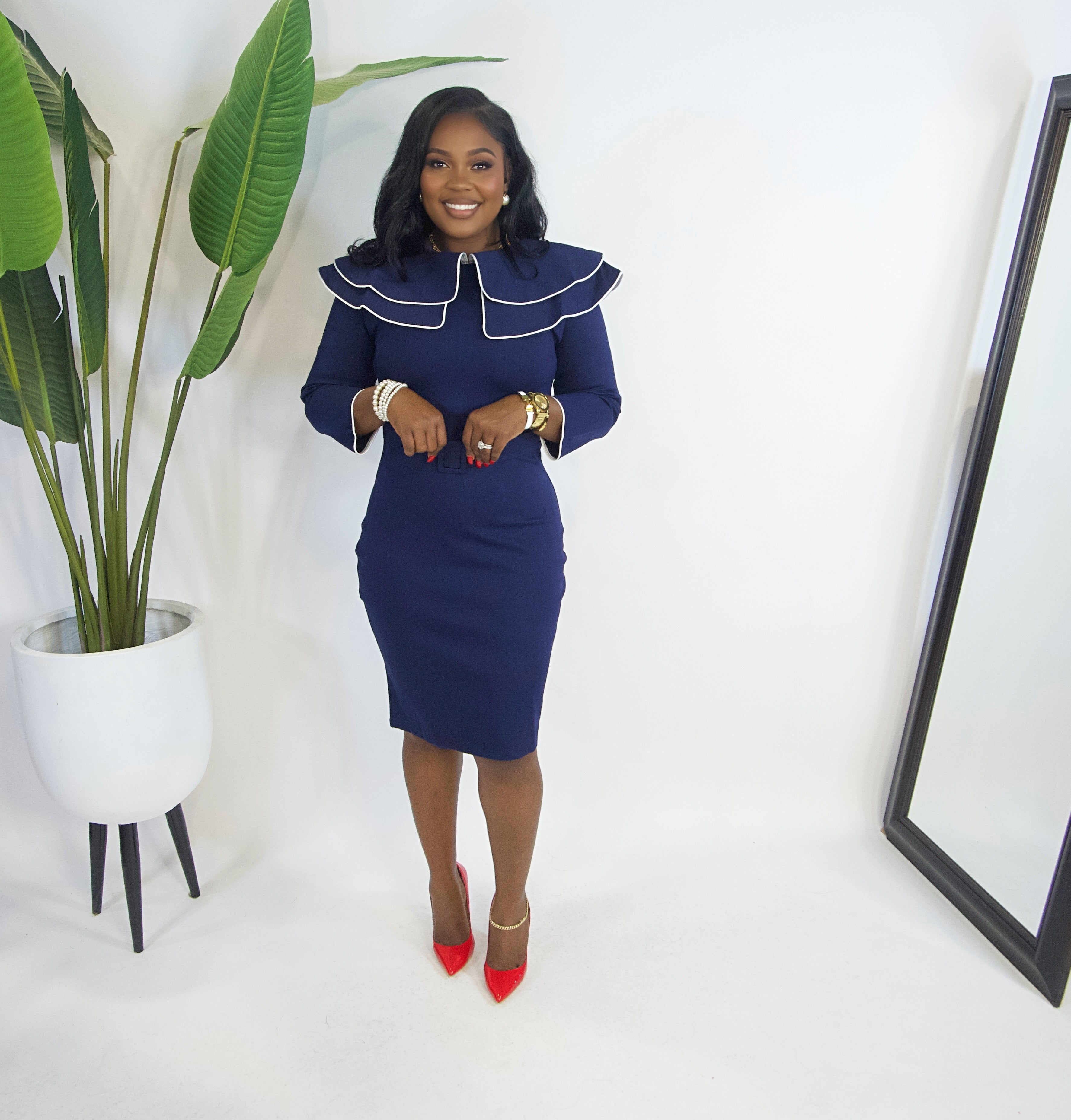 A sleek, tailored midi dress featuring a sculpted contrast-trim collar, long sleeves, and a self-belted waist. Polished, feminine, and designed for timeless, elevated wear.