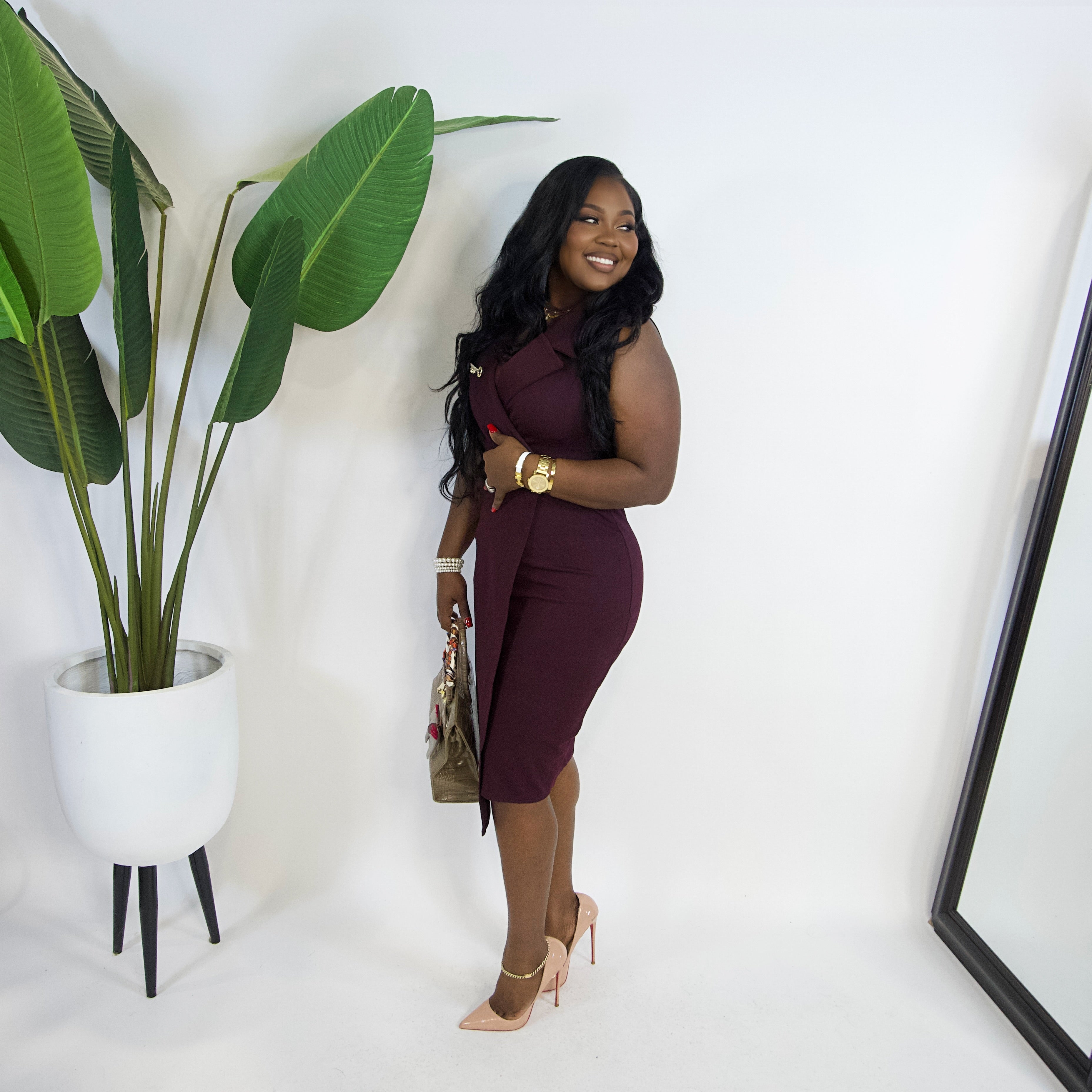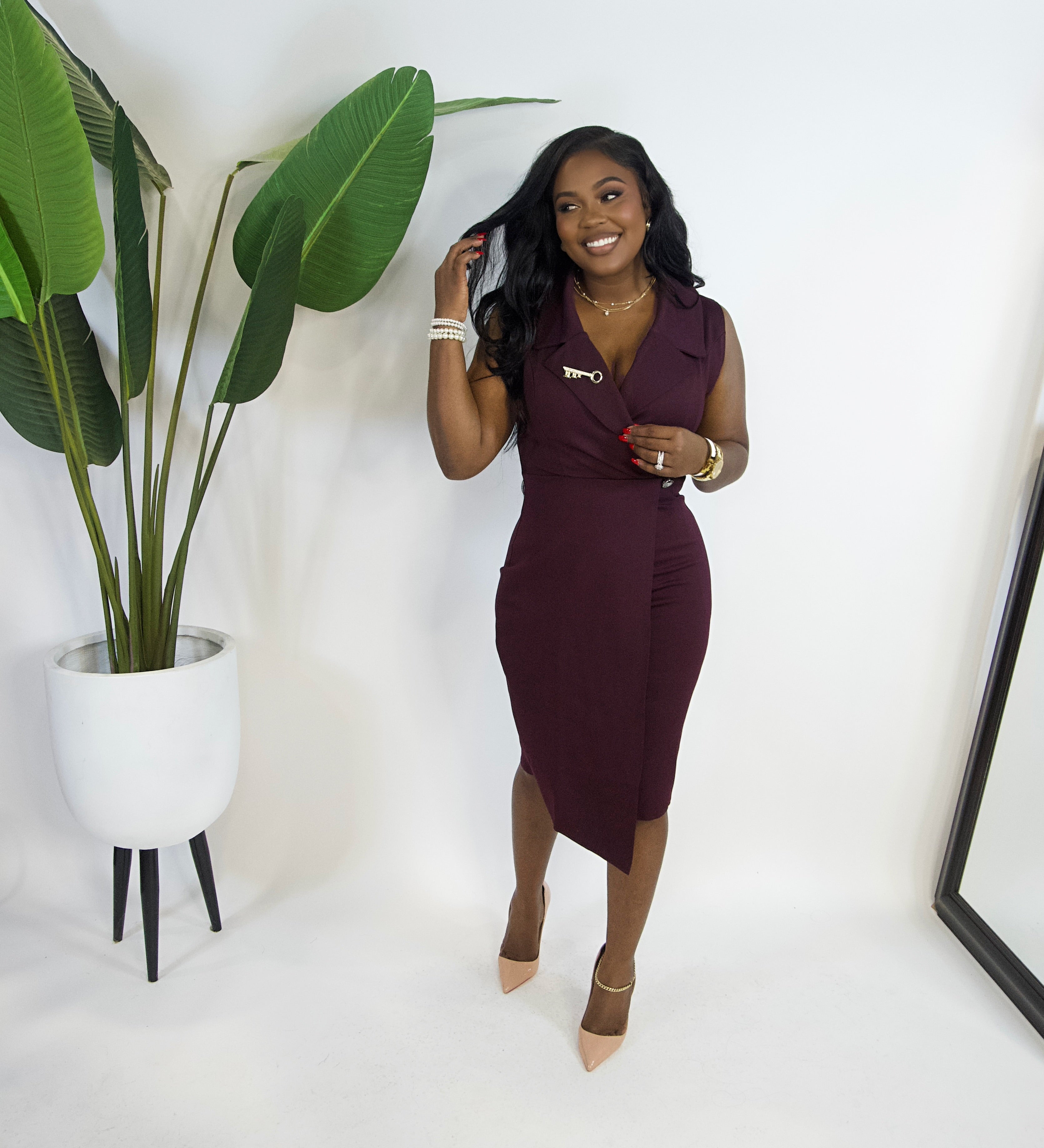 A sleek wrap-style midi with a structured lapel neckline and a flattering fitted silhouette. Powerful, polished, and designed to command attention.